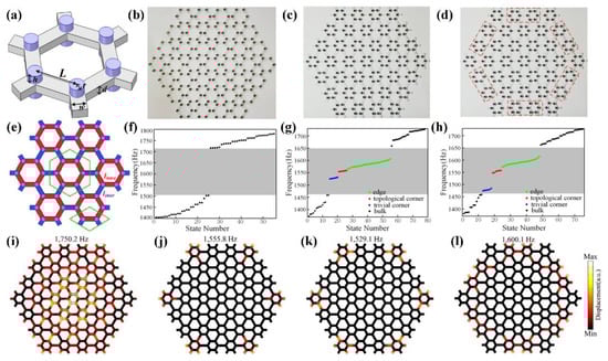 In 2019, Fan et al. constructed a HOTI with a 2D continuous elastic system via SSH models [106]. The composite unit cell with six magnets attached to each side is shown in Figure 5a, and the schematic of the honeycomb lattices is shown in Figure 5e. The intracell and intercell couplings could be changed by turning the lengths of acrylic beams and . Then we fabricated three large experimental honeycomb-shaped samples with 37 expanded unit cells (), shrunken unit cells () and shrunken unit cells with defects, respectively, as shown in Figure 5b–d. The numerically evaluated eigenfrequencies shown in Figure 5f–h correspond to Figure 5b–d, respectively. As we can see, Figure 5f show that there are only bulk states outside the forbidden band, the Figure 5g show that there are gapped edge states and in-gap corner states in the topological band gap, since the honeycomb-shaped sample with shrunken unit cells in Figure 5c is a topological structure. However, one type of corner states (marked by red in Figure 5g) in the band gap is topological, and the other is trivial (marked by blue in Figure 5g) in the topological structure. Figure 5h show that the eigenfrequencies of the trivial corner states are changed, inducing the defects. The simulated displacement field distributions of the topological structure are shown in Figure 5i–l. One of the simulated edge states (marked by green in Figure 5g) is shown in Figure 5l; the displacement field is almost completely localized along the boundaries of the sample except for the six corners. One of the topological corner states is shown in Figure 5j, which has immunity to defects. One of the trivial corner states is shown in Figure 5k, which is sensitive to defects and disorders. One of the bulk states (marked by black in Figure 5g) is shown in Figure 5i, and the displacement field is almost localized at the center of the sample. Combined with these diagrams, we observed the gapped edge states and two kinds of corner states, one kind of corner state is nontrivial whose partial vibration is located at the sharpest corner, while another kind of corner state whose vibration does not locate at the sharpest corner is trivial. In order to verify the relationship between corner states and corner points, we constructed a large triangular-shaped model and found that there are no topologically protected corner states in the regular triangle elastic phononic crystal plate, but only trivial corner states. Then we induced a topological index ( and represent topological charges +1 and −1, respectively) to explain this phenomenon. Consequently, the trivial corner states locate at the acute-angled corners of in the case of , while the nontrivial corner states locate at the obtuse-angled corners of in the case of .