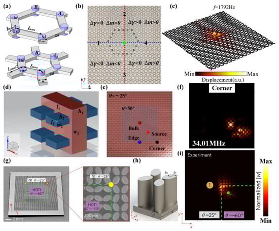 In 2021, there are also a few achievements on implementing higher-order states in mechanics [107,111,112,117]. Recently, Wu et al. experimentally demonstrated that higher-order topological states for elastic waves at MHz could emerge in an on-chip micromechanical metastructure [111]. The sample chip is constructed with two partial structures referring to a HOTI surrounded by a normal insulator (NI), as shown in Figure 6g. The unit cell with four elliptic pillars in a square lattice is shown in Figure 6h. Manipulating the rotation angle of the pillars could open the crystal bandgap and induce band inversion at the Brillouin zone corners. Specifically, the topological nature can be characterized by the topological index which can be calculated from the symmetry eigenvalues at high-symmetry momenta of the bands below the bandgap and corner charges. The topological index is and the corner charge is when , while the topological index is and the corner charge is when . Hence, the rotation angle of the pillars in the HOTI is , the rotation angle of the pillars in the NI is . The topological corner mode localized at one corner of the central square region is shown in Figure 6i.