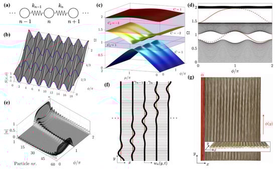 Recently, the topological pump in elastic systems has been demonstrated theoretically and experimentally [124,126,128,130,135,136,137]. In 2019, Rosa et al. firstly theoretically demonstrated the topological pump in spatially modulated elastic lattices [128]. The 1D elastic lattices connected by springs whose constant are defined by the sampling of a 2D surface at , where (p and q are co-prime) denotes q masses in a unit cell, denotes the pump parameter. The schematics of the 1D elastic lattices and the 2D surface is shown in Figure 7a,b. The value of controls the generation of the nonzero gap. The dispersion surfaces as a function of (the nondimensional wave number) and , and the band structure as the variation of about a finite chain of 60 masses are shown in Figure 7c,d. Of note is the fact that the topological nature is characterized by the Chern number: