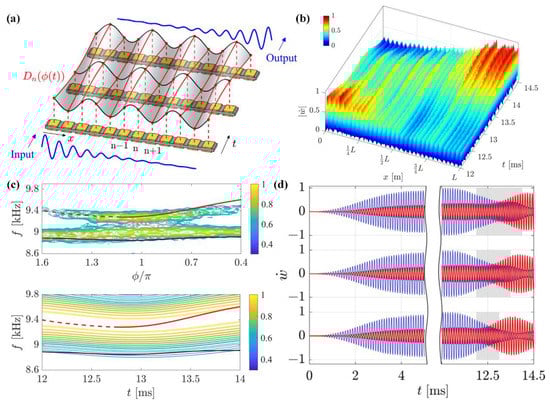 Temporal pump in electromechanical waveguides [135]. (a) The electromechanical elastic beam with modulated bending stiffness . (b) The schematic of the transient pump. (c) The dispersion diagram in quasistatic conditions (top) or in the time domain (bottom). (d) The influence of different phase modulation durations (top, 2 ms; middle, 1.5 ms; bottom, 1 ms) on edge-to-edge transitions.