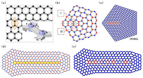 In 2021, Xia et al. experimentally realized valley-polarized edge states by introducing disclinations into elastic phononic plates [160]. The original honeycomb lattices elastic plate with two same cylindrical magnets attached to the top and bottom nodes of sublattices A and B is protected by symmetry, as shown in Figure 9a. Hence, the band could degenerate at the K point of the Brillouin zone and produce a Dirac cone state. Then changing the masses of sublattices A and B, the mirror symmetry of the unit cell will be broken, and a gap will appear to arise from the lifting of the Dirac cone. In addition, the modes at K point are inversed with each other. Furthermore, cutting a sector and gluing two boundary beams, a pentagonal elastic plate is shown in Figure 9b. Of note is the fact that the masses of the sublattices A and B above or below the interface is inversed. The tight-binding Hamiltonians [141] of this pentagonal elastic plate are , where v is the Dirac velocity, and signal valley Pauli matrices and sublattice Pauli matrices, respectively, m is the sublattice detuning and denote the sublattice distortion. Consequently, a topological edge state will be accessed at the interface attributed to the opposite valley polarizations of the two types of unit cells as shown in Figure 9c. Moreover, we constructed a more complex structure with a straight waveguide by inducing a disclination dipole on honeycomb lattices, as shown in Figure 9d. As such, a topological edge state could be observed in this phononic plate, as shown in Figure 9e.