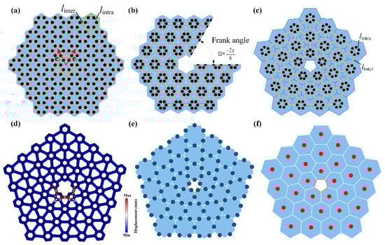 Bulk–disclination correspondence in elastic phononic plates. (a) The hexagonal lattices. The lengths of the intercell (intracell) beams are denoted by linter and lintra. (b) The topological nontrivial structure with a missing crystalline wedge. (c) The topological nontrivial structure with a pentagonal core. (d) One of the eigenmodes of the elastic system with 30 unit cells. (e) The distributions of Wannier centers (blue solid circles) of the topological nontrivial structure. (f) The distributions of Wannier centers (red solid circles) of the topological trivial structure.