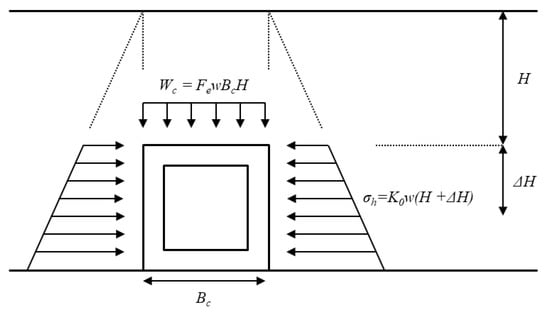 In general, the earth pressure acting on the box culvert buried in the ground can be divided into vertical and horizontal components. According to AASHTO [11], the vertical soil pressure acting on the box culvert is multiplied by the height (H) and unit weight (w) of the soil at the top of the box culvert, and a correction factor (Fe) is applied to account for the soil–structure interaction. Fe is dependent on the installation conditions of the box culvert (trench or embankment installation).