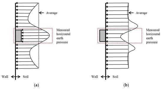 Seed et al. [20] presented two potential systematic errors, as shown in Figure 2, assuming that the earth pressure was systematically measured. Earth pressure gauges protruding from the wall are typically much less compressible than the soil around the sensor. Moreover, because the protruding earth pressure gauge is hard, it induces more horizontal earth pressure, and the pressure is exaggerated, as seen in Figure 2a. A second problem can arise when the earth pressure gauge is inserted into the wall, Figure 2b. Most earth pressure gauges require some deformation of the face to measure pressure. Unfortunately, even very small pressures can cause face deflection, which is sufficient to cause soil arching. This results in the soil pressure being understated. Therefore, Seed et al. [20] proposed a technique for avoiding these problems; because the earth pressure gauge is very stiff and displacement is marginal, it should be placed at the height of the wall.