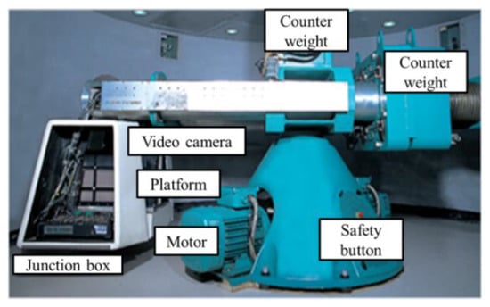 This device comprises a counterweight for gravitational acceleration, platform for inserting test instruments, junction box for converting multiple single connectors and multi connectors, driving motor, video camera that can observe the test screen in the platform, and a safety button.