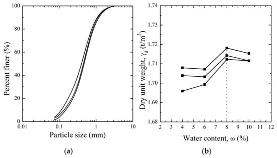 Sand was used in the centrifuge model test, and the particle size distribution curve from the sieve test according to ASTM D2487 [24] is shown in Figure 5a. The coefficient of uniformity (Cu) and coefficient of curvature (Cc) of the soil, as calculated from the particle size distribution curve, are 4.09 and 1.18, respectively. Accordingly, the soil was classified as poorly graded sand according to the USCS (Unified Soil Classification System). In addition, the ASTM D698 standard compaction test [25] was performed to determine the degree of compaction for the ground composition process. The result is shown in Figure 5b: the maximum dry unit weight is 1.715 t/m3, and the optimum water content is 8%.