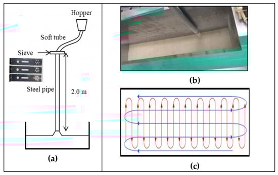 Sand pluviation is performed in the vertical direction up and down (red line), and then in the transverse direction (blue line). This process is then continuously repeated to form the ground. Finally, numerous experiments were conducted for target degree of compaction (95%). The length of the steel pipe was 2.0 m, and the diameter of the sieve was 4 mm, as is required for 95% degree of compaction.