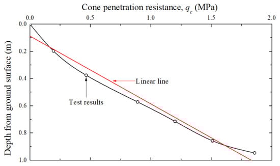 Particle size effects can be seen when testing different sized models on the same soil. The smaller the ratio of the model to the mean particle size, the higher the value of the axial friction and point resistance. Therefore, it is necessary to prove the homogeneity of the ground through a small cone penetration test [26,27,28]. For the sand pluviation method, the work skill of an experienced experimenter is the most important, and the homogeneity of the composed ground must be secured. However, in this study, the cone penetration resistance according to the gravitational acceleration could not be confirmed, and the cone penetration resistance according to the initial ground composition was confirmed, as shown in Figure 7. Based on the linear increase trend, homogeneity was confirmed in the initial ground composition process.