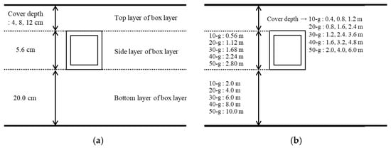 Figure 8 shows a schematic of the box culvert installed in the ground for the scaled model and actual model after gravitational acceleration. First, the lower ground is formed to a thickness of 20 cm using the method presented in Figure 6, and a box culvert is installed on the ground. Afterward, sand pluviation is performed on the side and top of the box culvert, and the final compaction degree of the entire ground is 95%. Meanwhile, the cover depth, which is the height between the top of the box culvert and the ground surface, was set to 4, 8, and 12 cm, respectively, and the horizontal earth pressure, which depends on the cover depth, was read from the sensor.