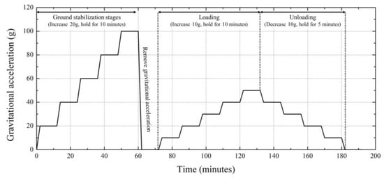 Accordingly, gravitational acceleration is increased by 20 g and removed when it reaches 100 g. In the loading stage, the gravitational acceleration was increased by 10 g to 50 g, and each load was maintained for 10 min. Finally, in the unloading stage, unlike in the loading stage, gravitational acceleration was decreased by 10 g to 1 g.