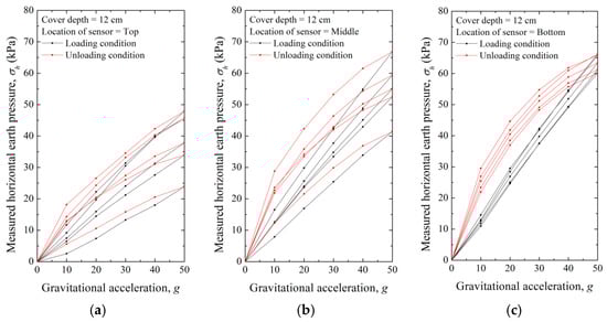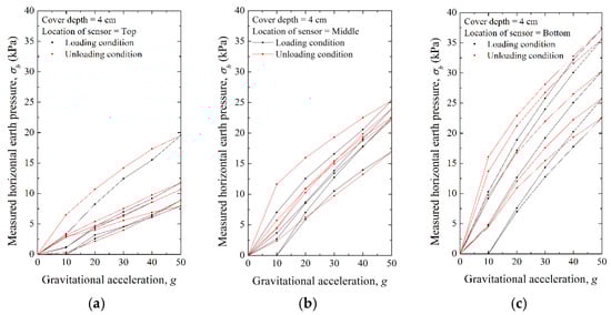 Measured horizontal earth pressure under loading and unloading conditions with cover depth of 4 cm; location of sensor: (a) Top, (b) Middle, and (c) Bottom.