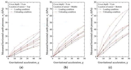 Measured horizontal earth pressure under loading and unloading conditions with cover depth at 8 cm; location of sensor: (a) Top, (b) Middle, and (c) Bottom.