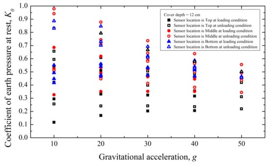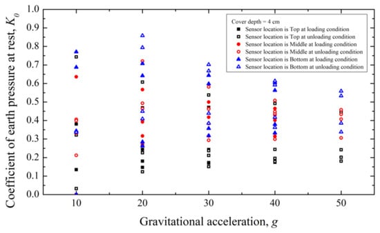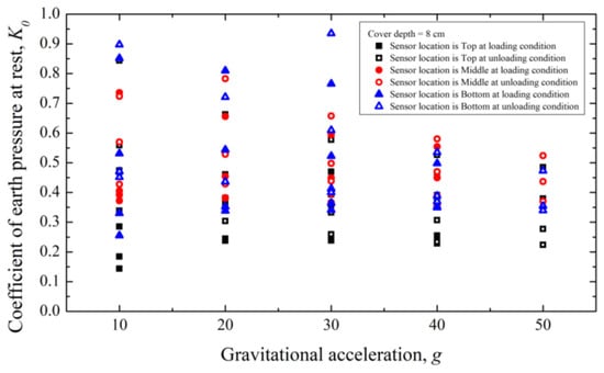 At all cover depths, the coefficient of earth pressure at rest tends to converge as the gravitational acceleration increases, except for the 30 g gravitational acceleration in Figure 17. Thus, the variability, including uncertainty during measuring the horizontal earth pressure at low gravitational acceleration, is large. A detailed analysis is performed later in Section 5, variability analysis.
