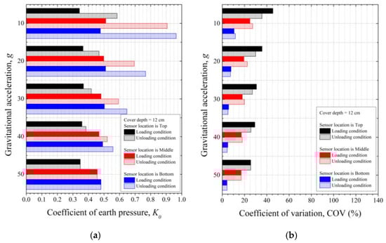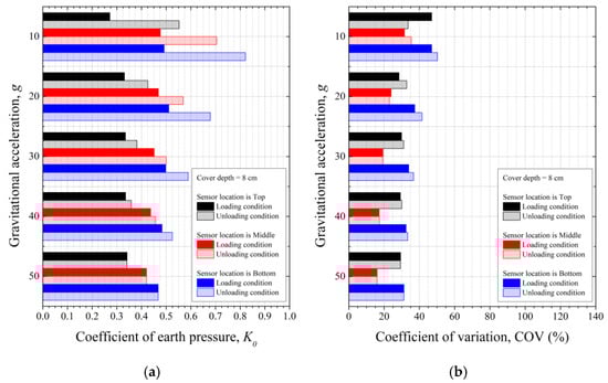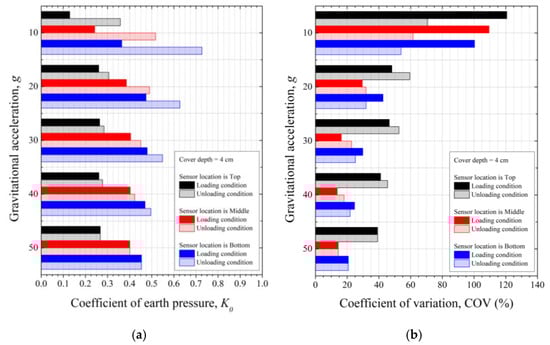 Variability analysis with cover depth at 4 cm: (a) Average and (b) COV of earth pressure with gravitational acceleration.