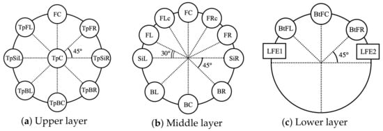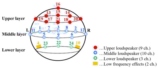 22.2 multichannel audio [] is a 3-D sound field reproduction systems, which has been developed for ultra-high definition television (UHDTV). Figure 1 and Figure 2 and Table 1 show the loudspeaker arrangement of 22.2 multichannel audio, the labels and installation intervals of loudspeakers, and the requirement of the loudspeaker arrangement, respectively. This system can be divided into three layers: upper, middle, and lower. It consists of nine loudspeakers in the upper layer, ten in the middle layer, and three in the lower layer along with two sub-woofers called low frequency effects (LFEs). One of the practical uses of the 22.2 multichannel audio is the theater bar for home use (https://www.nhk.or.jp/strl/open2018/tenji/t2_e.html) (accessed date 20 January 2022). The theater bar is the home reproduction system of 22.2 multichannel audio with a line–array loudspeaker. Recently, the theater bar as a consumer product has been studied in Japan (https://www.jas-audio.or.jp/journal_contents/journal202111_post16264) (accessed date 20 January 2022). According to the ITU-R standards [], 22.2 multichannel audio can achieve the following effects in sound field.