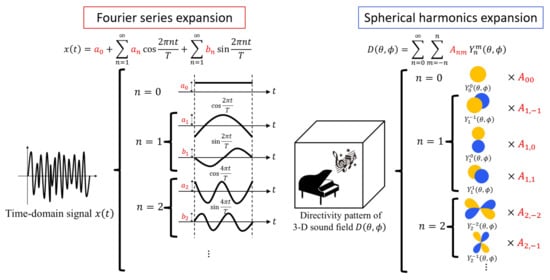 In this section, we propose a novel 3-D sound reproduction method for 22.2 multichannel audio based on SH expansion []. The proposed method controls the direction and distance of a 3-D sound image by controlling sound directivity on the basis of mode matching []. Mode matching generates weighting factors that match the reproduced directivity pattern with the target directivity pattern. In addition, the mode strength used in the mode matching includes the distance of the 3-D sound image. Here, in the spatial sound field, the directivity pattern consists of various types of basic directivity, such as monopole and dipole. On the basis of this fact, SH expansion [] analyzes the strength of each directivity pattern like a Fourier series expansion. Examples of Fourier series expansion and SH expansion are shown in Figure 4.
