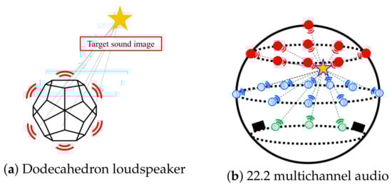 Three-dimensional (3-D) sound field reproduction systems have become increasingly popular as video technology has advanced. The 3-D sound field reproduction systems are classified with a psychoacoustics-based system and physical acoustics-based system. The binaural system and transaural system are traditional psychoacoustics-based systems []. These systems represent the sound pressure at a listener’s ears by using a head-related transfer function, which represents the reflection and diffraction by a user’s head and torso. In other words, the psychoacoustics-based system represents the direction of the sound image. On the other hand, physical acoustics-based systems, such as wave field synthesis [], are based on the Kirchhoff–Helmholtz integral and reproduce the sound field by using multiple loudspeakers. In [], the researchers proposed the sound field reproduction system by using dodecahedron loudspeaker array and achieved the reproducing sound field outside of the loudspeaker array. In [], higher-order Ambisonics (HOA) is used to reproduce a 2-D sound field in the surrounding area by a circular loudspeaker array and cylindrical loudspeaker array. These researches depict the effectiveness of using loudspeaker arrays to achieve accurate sound field reproduction. In this paper, we focus on a 22.2 multichannel audio [] as multiple loudspeakers.