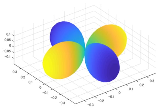 where is the order of the SH function, is the degree of the SH function, is the elevation angle, is the azimuth angle, and is the Legendre function. Figure 7 shows the shapes of the SH function at the order of and degree of in Cartesian coordinates. The color of the SH function means phase : yellow and blue show positive and negative values, respectively. This function can be applied to an orthogonal function expansion to determine the arrival direction of a plane wave. Therefore, any directivity pattern can be expanded using the SH function and coefficient in the SH domain as: