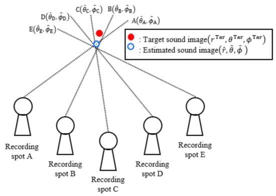 - Estimation of the position of the reconstructed 3-D sound image.Finally, the position of the reconstructed 3-D sound image was estimated by using the estimated direction of the sound image . As shown in Figure 10, the position was estimated by drawing a straight line from each recording position to the estimated direction. Then, the center position of the surrounding area by the five lines was treated as the estimated position of the sound image .