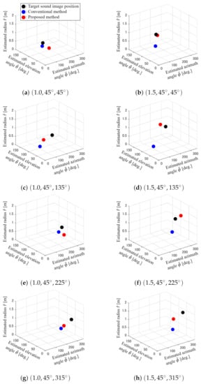 Figure 11 shows the estimated position of the reconstructed sound image for each condition (a)–(h) on the first trial and Figure 12 shows the error for each position. In Figure 11, the closer the red and black markers, the higher the accuracy of the sound localization. From Figure 11 and Figure 12, the proposed method can reconstruct the sound image close to the target position. The distance error of the proposed method is 0.17 m smaller than that of the conventional method on average. These results show the effectiveness of the proposed method, which includes not only the elevation angle and the azimuth angle but also the distance r. Here, the error of the proposed method is about 0.87 m at positions (a), (c), (e), and (g) at which the distance of the target sound image is 1.0 m, although the error of the conventional method is about 1.02 m. However, the error of the proposed method is about 1.30 m at positions (b), (d), (f), and (h) at which the distance of the target sound image is 1.5 m, although the error of the conventional method is about 1.49 m. These results indicate that the sound pressure and phase largely affect the sound localization in the case that the recording position, that is, the listening position, is close to the position of the sound image. Hence, the improvement of sound localization is more significant at positions (a), (c), (e), and (g) than that at positions (b), (d), (f), and (h).