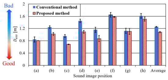 Focusing on the direction of the sound image, the error of the proposed method is about 0.90 m at positions (a)–(d), although the error of the conventional method is about 1.13 m. In other words, the proposed method accurately reconstructs the 3-D sound image in front of the listening position. However, the error of the proposed method is about 1.27 m at positions (e)–(h), although the error of the conventional method is about 1.39 m. In other words, the accuracy of the reconstruction of the 3-D sound image behind the listening position degrades for both the conventional and proposed methods. This is because the dummy head microphone represents a human auditory system, that is, the accuracy of the sound localization behind the listening point is lower than that in front of the listening point. However, the error of the proposed method is lower than that of the conventional method in all conditions except for position (h), where it is inferred that the reverberation of the room affects the sound localization. From these results, it can be said that the proposed method can reproduce the 3-D sound image well in terms of distance and direction compared with the conventional method. Additionally, the error of the distance is still large because the proposed method does not consider the room reverberation []. Hence, we will improve the proposed method to overcome this problem.