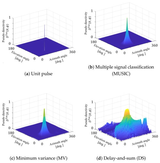 In this experiment, the clarity of the reconstructed sound image for the given directivity in the proposed method was evaluated. The directivities were generated by four different methods; (i) giving only the unit pulse at the target position, (ii) MUSIC, (iii) minimum variance (MV) method [], and (iv) delay-and-sum (DS) method []. These directivities are shown in Figure 13. In this experiment, the directivity patterns were obtained for each position shown in Table 4. Hence, the 32 directivity patterns were used in the experiment. Then, the weight was calculated for each directivity pattern. After that, the 3-D sound image was reconstructed by 22.2 multichannel audio and the emitted sound was recorded by the dummy head microphone. Using the recorded sound obtained at the left and right ears of the dummy head microphone, the inter-aural cross correlation (IACC) [] was calculated as the evaluation metric. The IACC is obtained by: