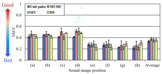 Figure 14 shows the IACCs for each position (a)–(h). In Figure 14, “Unit pulse” represents the IACC for the sound image by using the unit pulse at the target position, “MUSIC,” “MV,” and “DS” represent the IACC for the sound images by using MUSIC, the MV method, and DS, respectively. From Figure 14, the IACCs for Unit pulse, MUSIC, MV, and DS are 0.33, 0.37, 0.36, and 0.35, respectively. This result indicates that the directivity with not only the peak but also the sidelobe affects the high clarity of the sound image in the proposed method. In addition, the clarities of the sound image in front of the listening point are higher than those behind the listening point. This is because the many loudspeakers are placed at the front of the 22.2 multichannel audio and it is easy to reproduce the clear sound image to the front side of the 22.2 multichannel audio. From these results, it can be said that the proposed method is effective for reproducing the 3-D sound image in the 22.2 multichannel audio by using the given directivity pattern with the sidelobe.