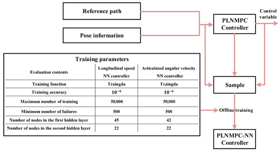 In addition to ensuring the control precision of path tracking control, the controller should also improve the computational complexity. The method for generating a neural network controller with MPC training samples solves the problem of poor real-time response of MPC controllers while ensuring control precision [113]. However, the training samples used in the aforementioned method lose the feedforward information. This problem can be solved by reducing the number of control steps of the controller and using a point-to-line NMPC neural network (PLNMPC-NN) in articulated vehicle path tracking control [114]. The PLNMPC method uses the position and state errors between the predictive horizon and on the reference path as penalty terms and generates the training samples in the non-global coordinate system. The training process and training parameters of PLNMPC-NN are presented in Figure 8.