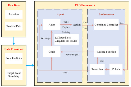 As compared with the traditional MPC controller, the adaptive MPC path tracking controller based on reinforcement learning further reduces the system overshoot and oscillations. It optimizes the performance of system dynamics and steady-state error. The hierarchical reinforcement learning method improves the generalization ability of reinforcement learning for optimal path tracking in wheeled mobile robots [117]. The behavior–reward scoring mechanism of reinforcement learning is used to learn the behavior rules so that the unmanned surface ships are able to estimate the best path tracking control behavior [118]. The proximal policy optimization (PPO) method is used as a deep reinforcement learning algorithm and combined with the traditional pure pursuit method to construct the vehicle controller architecture [119]. The blend of such controllers makes the overall system operations more robust, adaptive, and effective in terms of path tracking. Similarly, the PPO method is also used to achieve the trade-off between smooth control and path errors by designing the reward function to consider the smoothness and tracking error [120]. Figure 9 presents the flowchart of PPO control framework. The trained model can be nested in the combined controller to improve the accuracy of path tracking control on the basis of the interactions with the environment.