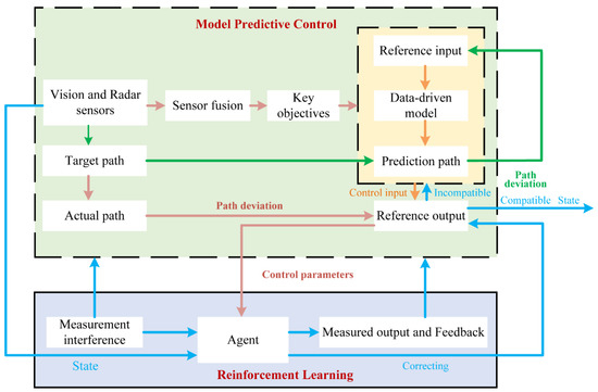 On the basis of the aforementioned works, we propose a reinforcement learning-based model predictive control (RLB-MPC) path tracking control framework. Additionally, the output of the controller is optimized on the basis of the reinforcement learning model. First, the predictive path is obtained by controlling the data-driven prediction model in the path-tracking controller. The target path is obtained by using visual and radar sensors. Second, the path deviation generated by the comparison between the predicted path and the target path is considered as the optimization objective. Finally, the path-tracking controller interacts with the real environment on the basis of the reinforcement learning model and corrects the path deviation generated by the comparison between the actual path and the optimized predicted path. The state information that conforms to the internal reward and punishment function of the reinforcement learning model is returned to the reference output and output directly. The other state information is returned to the MPC internal optimization until it meets the requirements of direct output. The RLB-MPC control framework is shown in Figure 10.