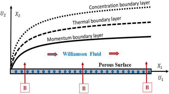 The flow of Williamson fluid (WF) is considered over a heated flat surface. The surface was taken as porous, and an external magnetic field was applied perpendicular to the flow. The heat transfer in fluid with heat source/sink effect was entertained, and concentration aspects of fluid were taken in the presence of a first-order chemical reaction. At the surface, both temperature and velocity slip effects were also assumed. The physical model of the flow problem is given in Figure 1. The present physical model was studied by using the continuity equation, Cauchy momentum equation, energy equation, and concentration equation. The said ultimate equations are: