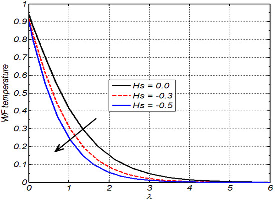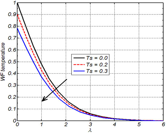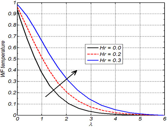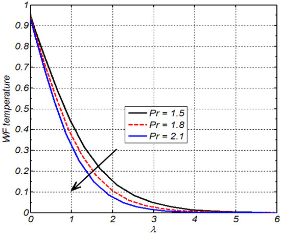 The WF temperature dependency on Pr, Hs, Ts, and Hr was examined and offered in terms of line graphs, as shown in Figure 6, Figure 7, Figure 8 and Figure 9, respectively. To be more specific, the influence of Pr on temperature is depicted in Figure 6.