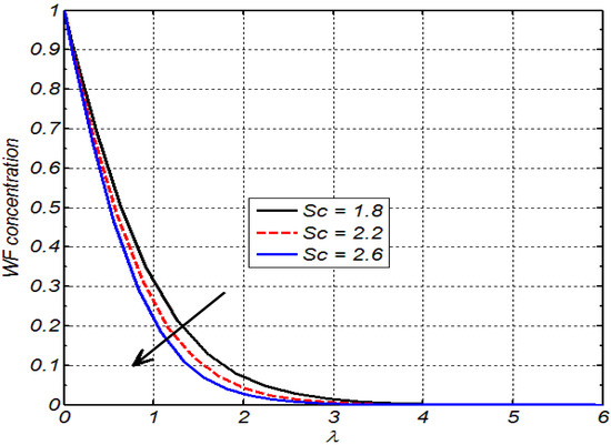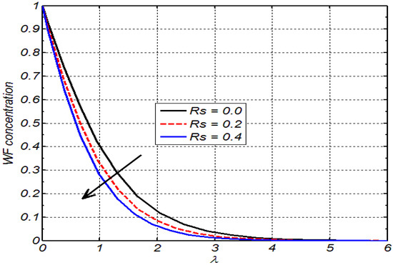 In this case, the positive variation in Pr = 1.5, 1.8, and 2.1 was taken into account. We have seen that when we have such a higher iteration, the temperature drops. Because Pr has an inverse relation with the fluid thermal diffusivity, we witnessed a decline in thermal diffusivity and, as a result, a considerable drop in WF temperature when we iterated Pr = 1.5, 1.8, and 2.1. The effect of Hs on WF temperature is depicted in Figure 7. WF temperature decreased when we iterated Hs = 0.0, −0.3, and −0.5. Iterations with Hs = 0.0, −0.3, and −0.5 caused energy loss and a drop in the overall temperature. The influence of the thermal slip parameter on WF temperature is offered in Figure 8. Ts = 0.0, 0.2, and 0.3 were employed in this line graph investigation. It is worth noting that we got a non-thermal case for Ts = 0.0. In this situation, the temperature appeared to be higher than Ts = 0.2 and Ts = 0.3. Overall, the WF temperature appeared to be falling as Ts increased. Figure 9 depicts the impact of heat generation on the thermal flow regime of a WF fluid towards a porous magnetic surface. The WF temperature increased dramatically when we iterated Hr = 0, 0.2, and 0.3. When Hr = 0.0, the thermal flow regime has no heat-producing impact, and the temperature of WF is smaller in magnitude than when Hr = 0.2 and 0.3 are utilized. This is because energy is generated inside the flow regime when we iterate the Hr, resulting in a rise in WF temperature. The impact of Sc and Rs is examined on WF concentration, see Figure 10 and Figure 11. Particularly, Figure 10 deals with the impact of Sc on WF concentration. Sc was carried out in the following way; Sc = 1.8, 2.2, and 2.6. The WF concentration decreased as we iterated Sc. This effect was comparable to the Pr effect on WF temperature. As the Sc value increased, the mass diffusivity reduced, and the concentration of WF fell. The flow was considered with chemical reaction, and the resultant flow variable was the chemical reaction parameter Rs. In this direction we iterated Rs = 0.0, 0.2, and 0.4. It was found that for Rs = 0.0, the WF flow was non-reactive, and one can note that here, the concentration magnitude was higher as compared to Rs = 0.2 and Rs = 0.4. Together, the WF concentration showed declining values towards Rs = 0.0, 0.2, and 0.4.