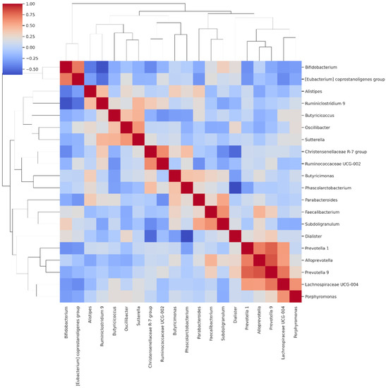 Using the centred log ratio data, we performed the LASSO procedure, which resulted in selecting a small subset of microbes in each taxon (see Supplementary Material for the exact species selected). Using this subset, we constructed correlation heatmaps to investigate structural differences between patients with OSA controls at different taxonomic levels. Spearman correlations were used; clustering on the heatmaps was achieved using the Euclidian distance measure. In general, we did not notice major differences in the correlation structure of the data between the examined groups; however, there were some minor findings, especially at the genus level (Figure 1 and Figure 2). In both figures, a clear positively correlated cluster can be identified, mainly composed of genera of the Prevotellaceae family as well as the Porphyromonas and Lachnosporaceae genera. However, the correlations, especially with the Porphyromonas genus, are much clearer in the controls, which may signal a disbalance of flora in the OSA group.