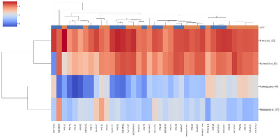 At the phylum level, the relative abundance of Actinobacteria was lower (p = 0.03), whilst the relative abundance of Proteobacteria was higher (p = 0.03, Figure 5).