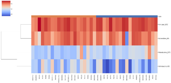 As a next step, we investigated similarities or dissimilarities between the two groups based on the CLR data. Using PERMANOVA we did not observe any significant results. To further investigate, we plotted beta-diversity heatmaps at the four examined taxonomic levels using the subset of microbes we obtained from the LASSO. Clustering OSA and non-OSA groups using the Euclidian norm as a distance measure did not separate them clearly at any taxonomic level. For reference, the beta-diversity heatmap at phylum level clustered on both axis is attached (Figure 3). To visualise if there were any differences between the relative abundances of the selected microbes in patients with OSA and non-OSA controls, we also plotted the same heatmaps with separating the two groups (OSA, non-OSA) on the x axis, which made it possible to point out any differences in the relative abundance of the microbes at different taxonomic levels. With this method, we can see minor differences at the phylum level in the relative abundance of Actinobacteria. CLR values of Actinobacteria are lower in most OSA patients (Figure 4).