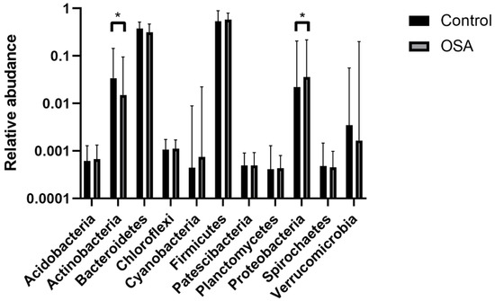 Relative abundance of gut bacteria at the phylum level. Relative abundance of gut bacteria is plotted as median and range. Significant differences between the control and obstructive sleep apnoea (OSA) groups are marked with *.