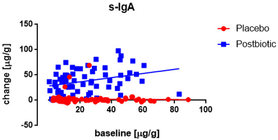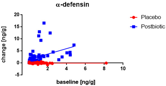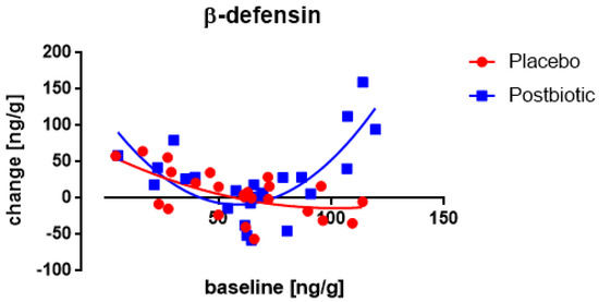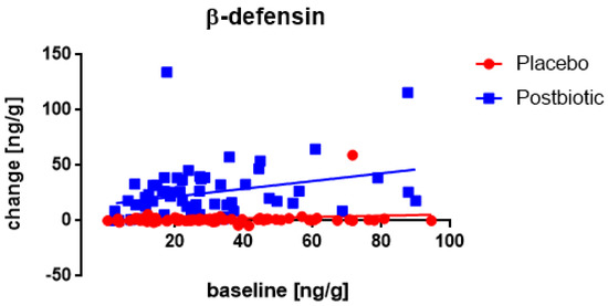 Overall, after consumption for 3 months the changes in all biomarkers, except that of β-defensin, were inversely associated with the baseline value of the respective biomarker while the increase in values of α-defensin and s-IgA was significantly larger after consumption of the postbiotic than after that of the placebo.