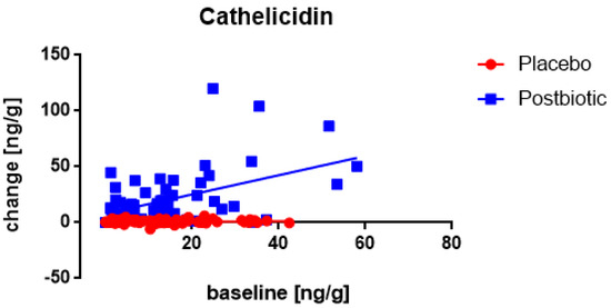 A significant (p < 0.001) association between the fecal concentration of cathelicidin at the baseline and the change in these concentrations after 3 months of consumption was observed in both groups (Figure 3), being inverse (the higher the baseline concentration the lower the increase). There were no differences in these changes between the postbiotic and the control product established. No impact of any confounder on the change in concentrations was noted.