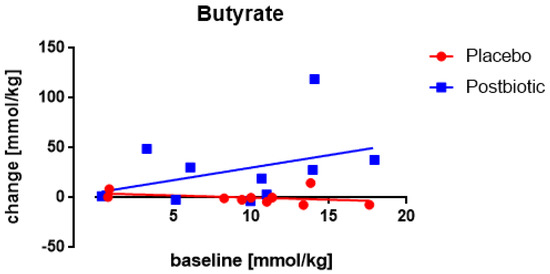 No significant association between the fecal concentration of butyrate at the baseline and the change in these concentrations after 3 months of consumption was observed (Figure 9). Throughout the range of baseline values, the increases were significantly (p < 0.002) larger for the postbiotic group than for the control group. Both gender and age yielded a significant association with the increases in concentrations: females showed a larger (p < 0.03) increase than males, and older children a larger (p < 0.02) increase than younger children.