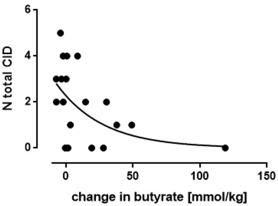 A negative association between the increase in butyrate and the number of common infectious diseases (CID: both respiratory and gastro-intestinal tract) was observed (p < 0.03) (Figure 10): the higher the increase in butyrate the lower the number of CID (Figure 10). The observed association showed an exponential relationship: N total CID = 2.28.e (−0.029.increase in butyrate), showing an asymptotic level at the theoretical value of no total CID at relatively high levels of butyrate.