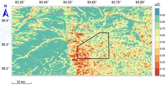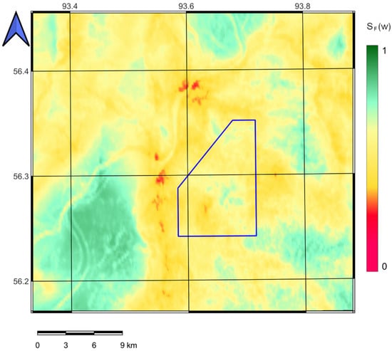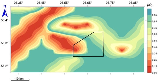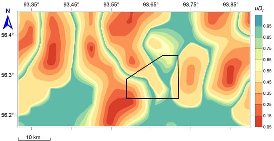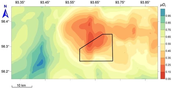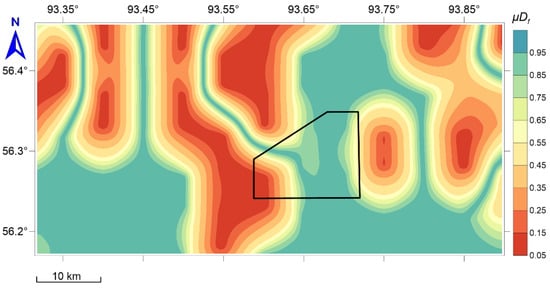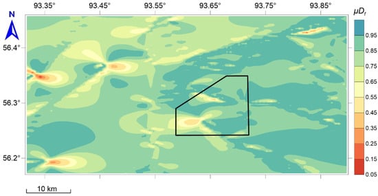 The transformation F → translates vector analysis concerning the system of functions F into scalar analysis for the final measure of anomaly , which, in terms of decision theory, is the reduction of a multicriteria problem to a scalar choice of a utility function. In terms of geodynamic zoning [36], the criteria for estimating the value of according to the system of features are determined according to Table 1. This approach to the ranking is adequate; if an integral measure is expressed in the range 0–1, then the conditions и mean the absence or the presence of safety (anomalies), respectively. The interval indicates uncertainty and the need for additional research.