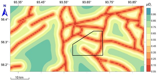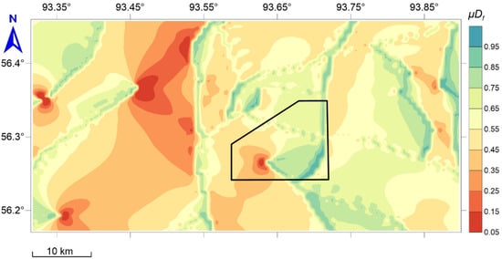 In studying the stability of a structural-tectonic block, the key issue is the macroscopic manifestation of the geodynamic process. In the Earth’s crust, this macroscopic manifestation is most often represented by the relative displacement of parts of a massif concerning each other. Analysis of the processes occurring at the boundaries between structural-tectonic blocks is a necessary step for the creation of modern analytical and numerical geodynamic models [44]. For this, we added the indicators , which characterizes fault density, and ϼ(п,), which characterizes proximity to tectonic faults.