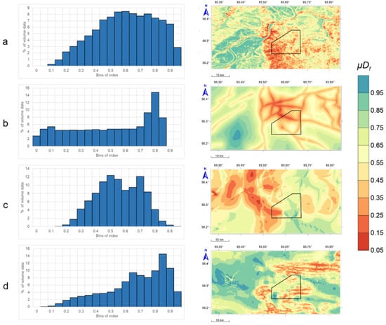 Integral measures geodynamic safety histograms values into groups: (a)—measure of safety by geomorphological variability, ; (b)—measure of safety by tectonic fault density, ; (c)—measure of safety by stress-strain state, ; (d)—measure of safety by magnetic field anomalies, .