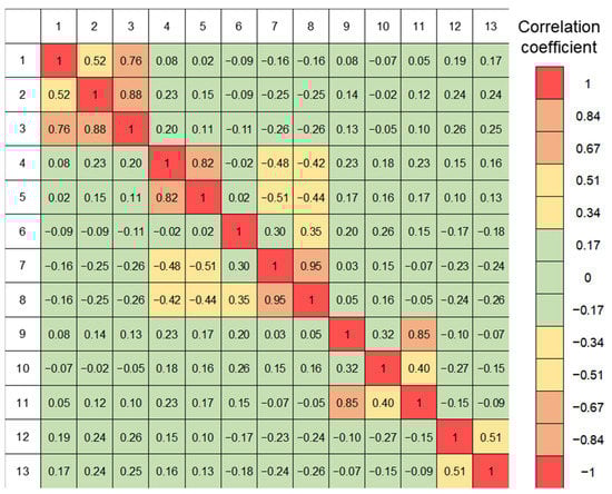 Correlation matrix the measures of dynamic activity indexes : 1—relief index, ; 2—relief index, ; 3—relief index, ; 4—proximity to tectonic faults index, ; 5—fault density index, ; 6—index of stress tensor component ; 7—index of stress tensor component, ; 8—index of stress intensity, ; 9—index of strain tensor component, ; 10—index of strain tensor component, ; 11—index of dilatation strain ; 12—magnetic field variability index, ; 13—magnetic field variation gradient, .