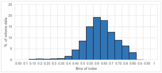 The distributions of the integral measures within the groups differ significantly. The integral measure of geomorphological variability is characterized by a uniform distribution of data in the measurement interval from 0.45 to 0.9 (Figure 13a). The geomorphological variability in the study area is not high. A large part of the area is flat with low elevation differences (Figure 1), but small areas of high-degree geomorphological variability can also be observed with a relative geodynamic instability measurement in the range of 0.1–0.25. The integral measure of tectonic fault density has a uniform distribution of values between 0 and 0.75. About 31% of all data fall within the relative geodynamic stability interval of 0.75–0.9 (Figure 13b). The integral measure of the stress-strain state has a distribution close to normal, and about 85% of all data fall into the 0.25–0.75 transition range (Figure 13c). Up to 14% of all nodes are in the area of relative geodynamic stability. The integral measure of magnetic field anomaly variability is not uniformly distributed over the intervals. The 0.75–1 interval of relative geodynamic stability accounts for up to 47% of all data, the 0.25–0.75 interval of transient values for about 50% of all data, and the 0–0.25 interval of relative geodynamic instability for about 3%.
