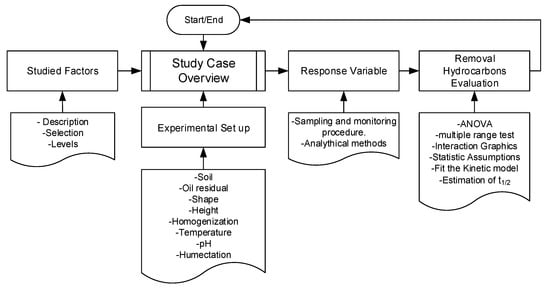 The evaluation of two study cases with hydrocarbon pollutants, different scales, and biostimulation operation was systematized. Then, two categorical multifactor arrays were designed, randomized, and performed. This kind of design is useful for situations where the main interest is to compare levels of two or more categorical factors. The procedure creates a multilevel factorial design with runs at each combination of the factor levels. In both cases, the effects of two factors on the single response variable total petroleum hydrocarbons (TPH) concentration were assessed. For each study case, the experimental runs are described, namely:
