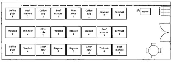 The layout of the experimental units was selected using a simple random procedure, assigning a randomized number to each biopile that matched a specific position in the experimental polygon area. The distribution is shown in Figure 2.