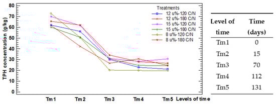 Specifically, in test M, the Treatment M1 (8 WC%-120 C/N) had the lowest TPH concentration at each level of time after the first 15 days. Likewise, after 71 days M3 (12 WC%-120 C/N) was ranked second with lower TPH concentration, suggesting not only the best degradation of the treatments with the less C/N ratio but also the influence of water content in the first period of the run. These findings are consistent with the previous ones modelled by Raffa et al. [] using an RSM model, confirming the accurateness of the evaluation method adopted. As commented in the results section, after the third month, the TPH concentration decreasing was negligible for all treatments. This could represent a crucial issue to estimate the times for the in situ exploitation of the technology.