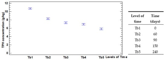 The monitoring of the TPH concentration was done at 0, 60, 90, 150, 240 days, corresponding with the levels of the factor “Time”.